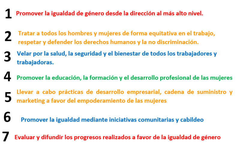 Los 7 principios para el Empoderamiento de las Mujeres (WEPs) se resumen en el gráfico.
